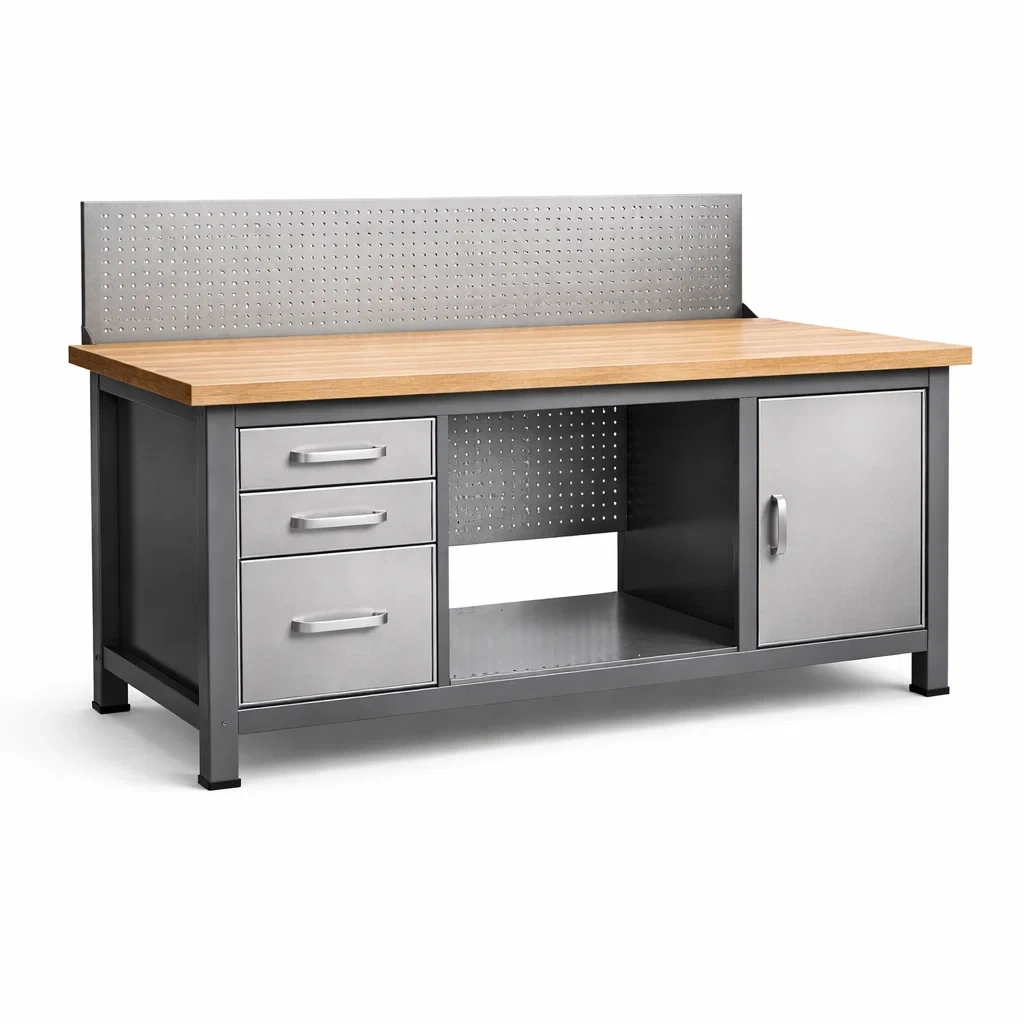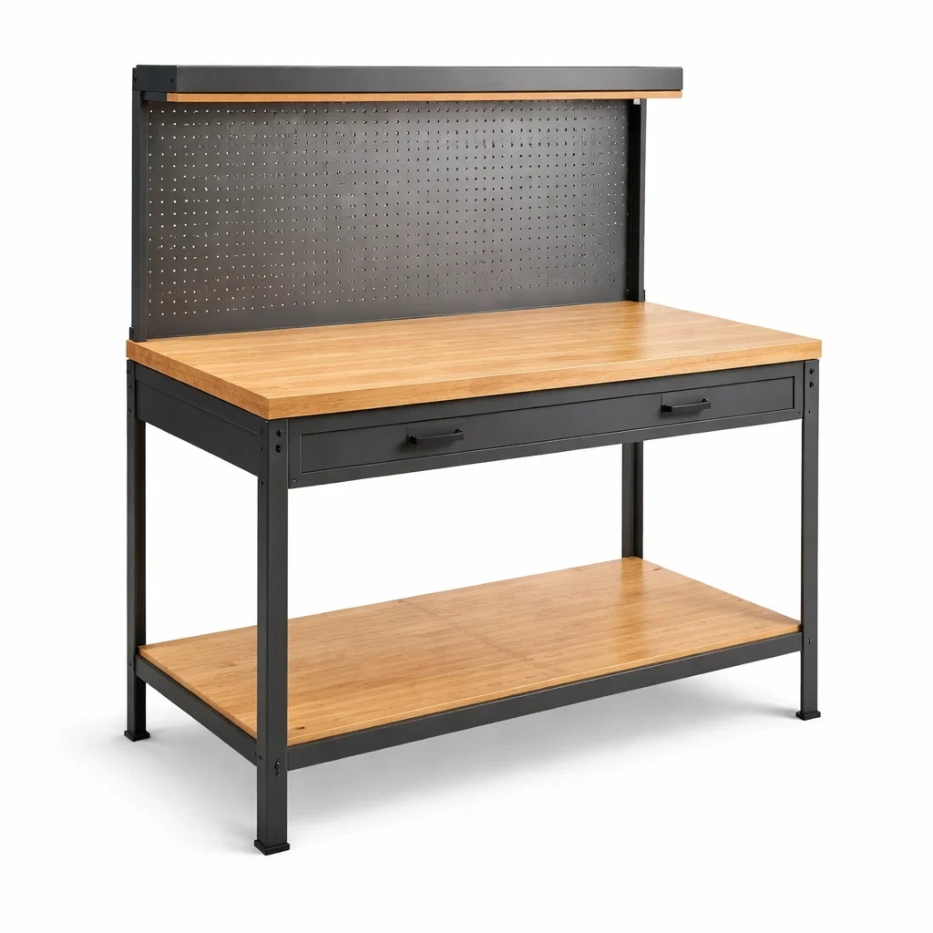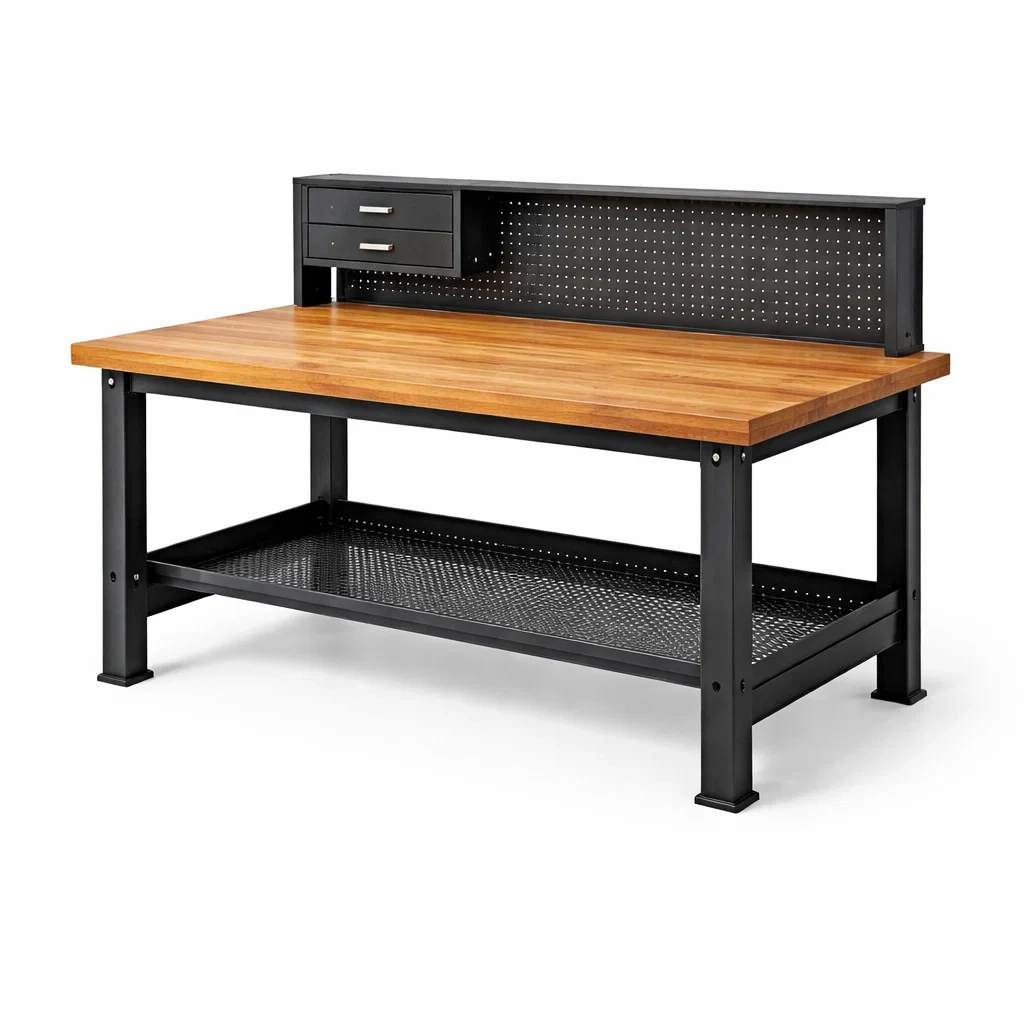 Établi en bois et métal avec panneau perforé
