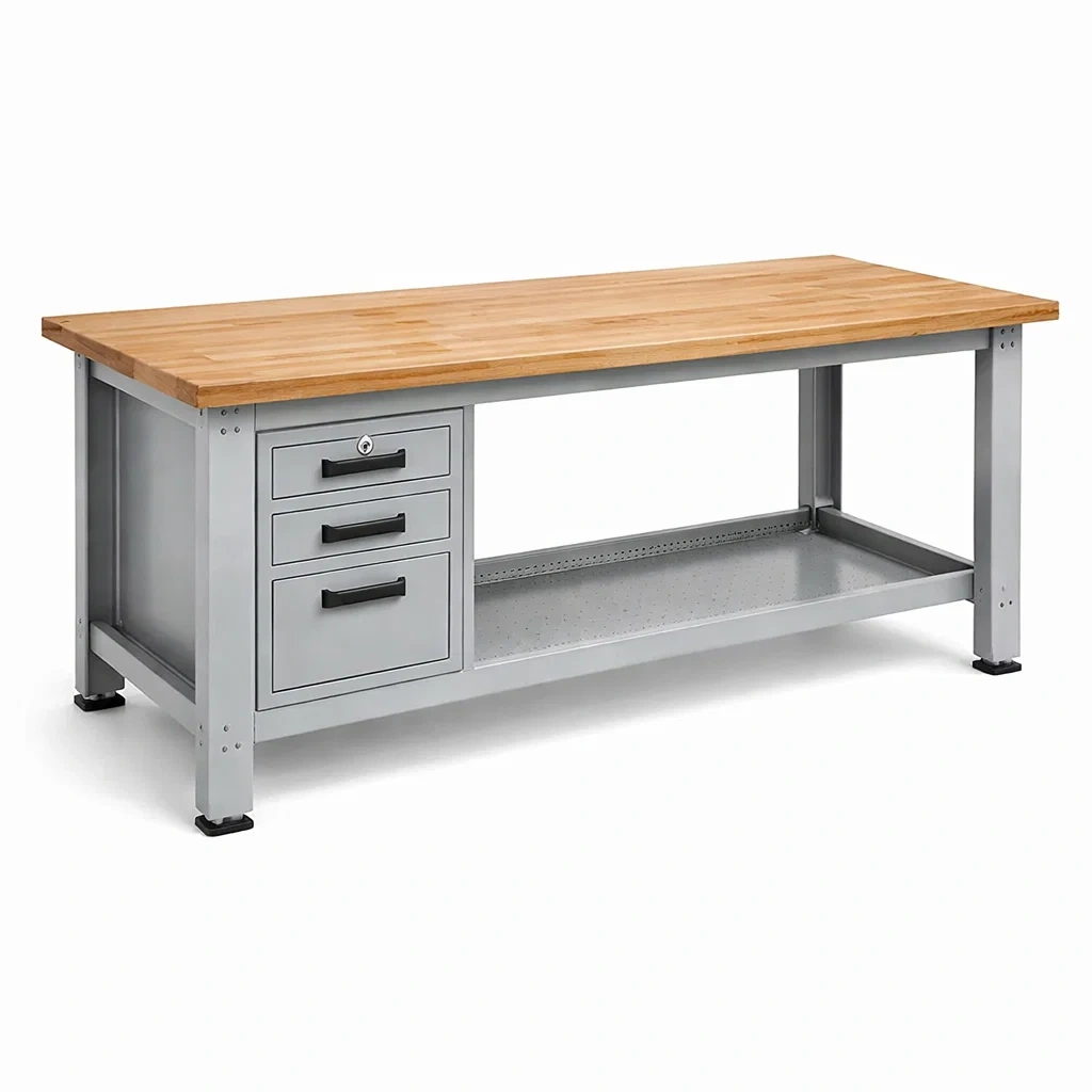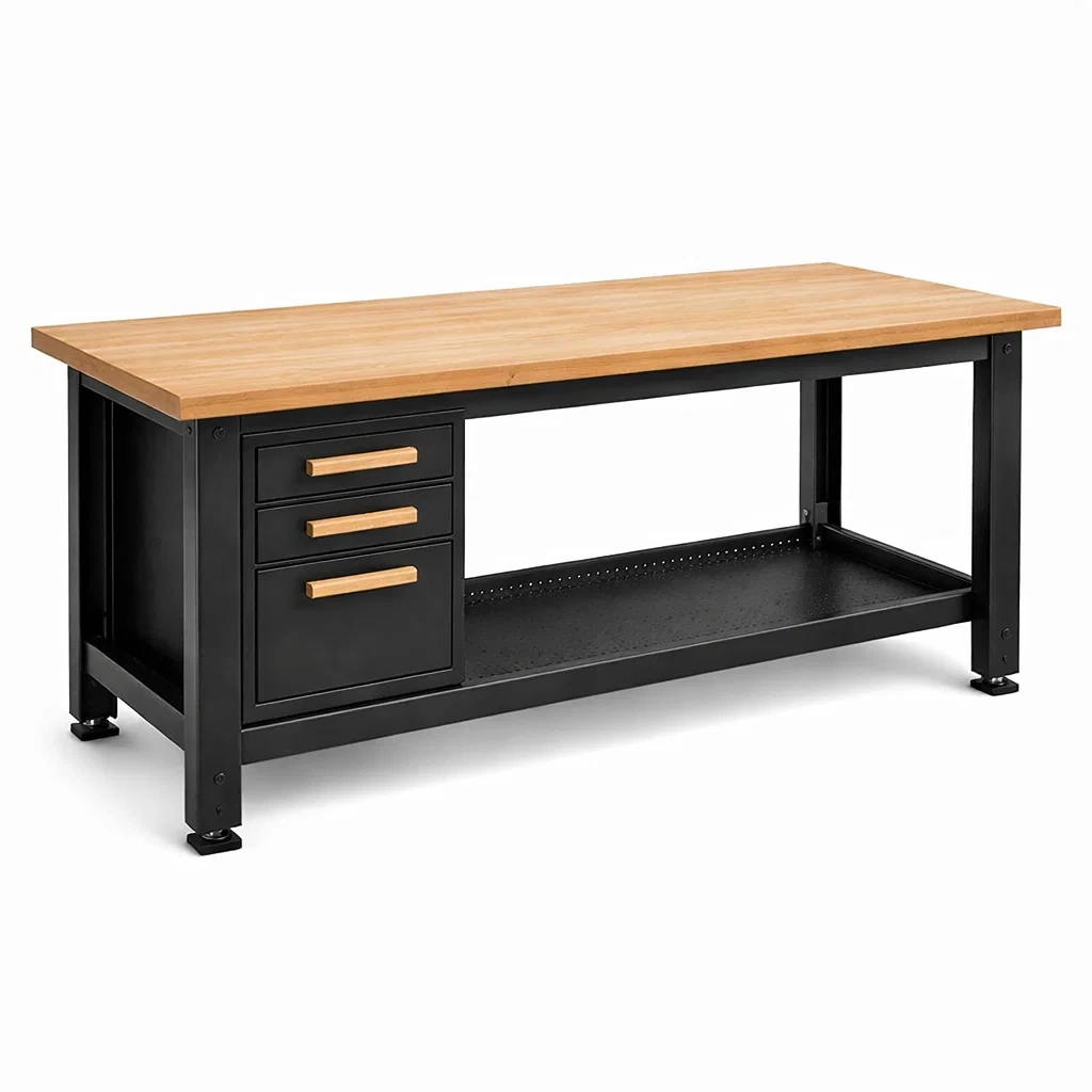 Établi en métal avec plateau en bois massif et tiroirs